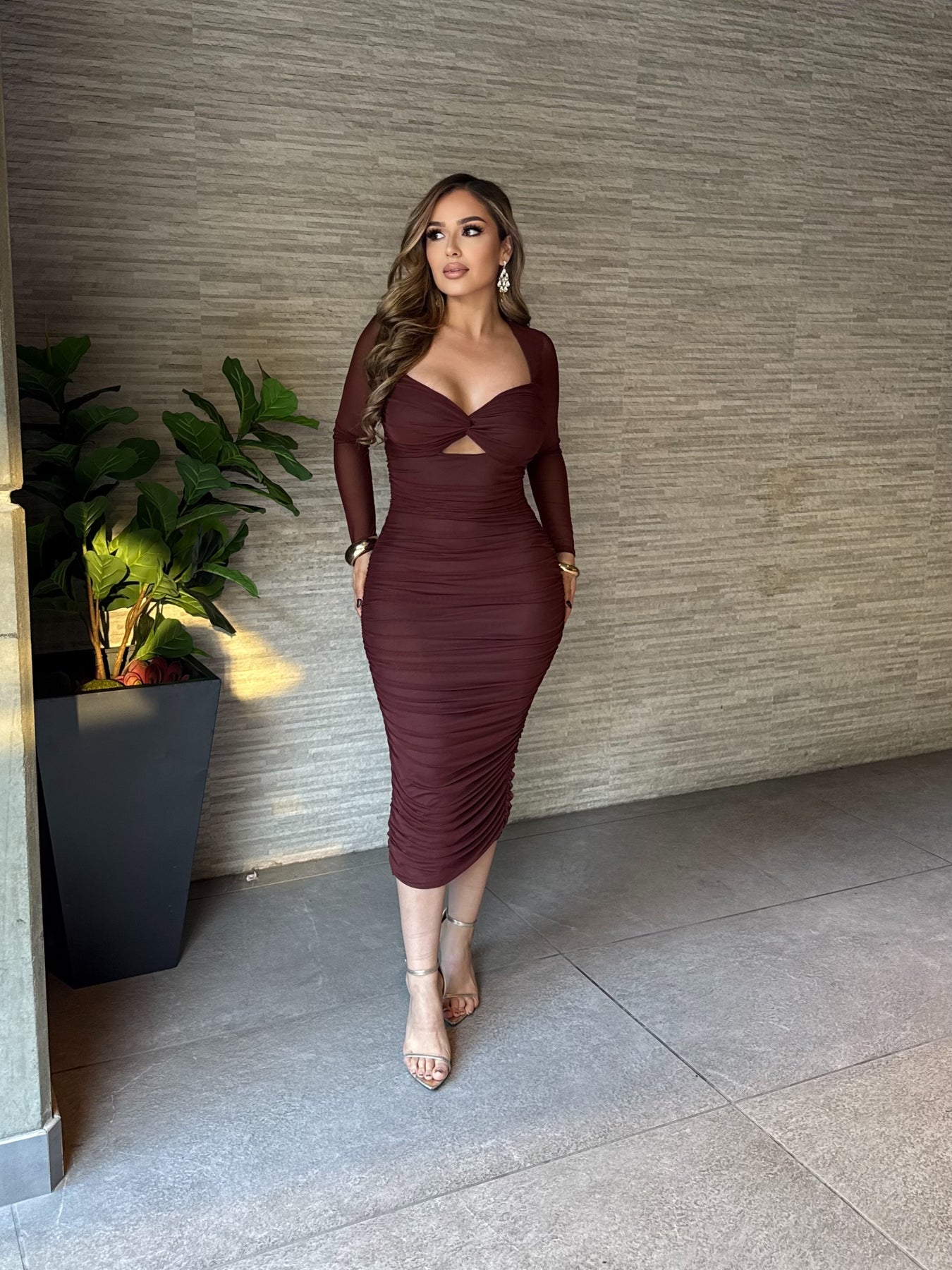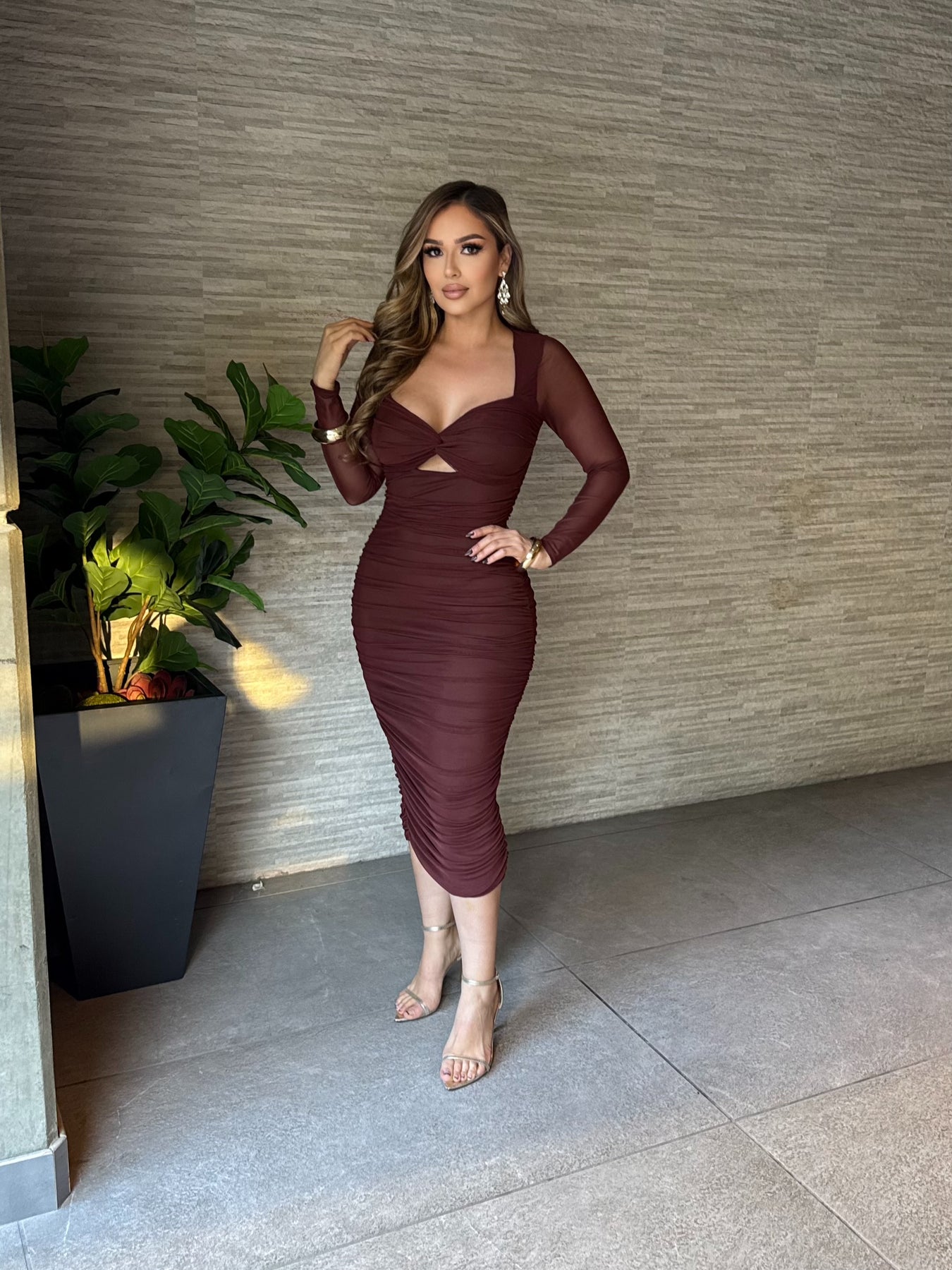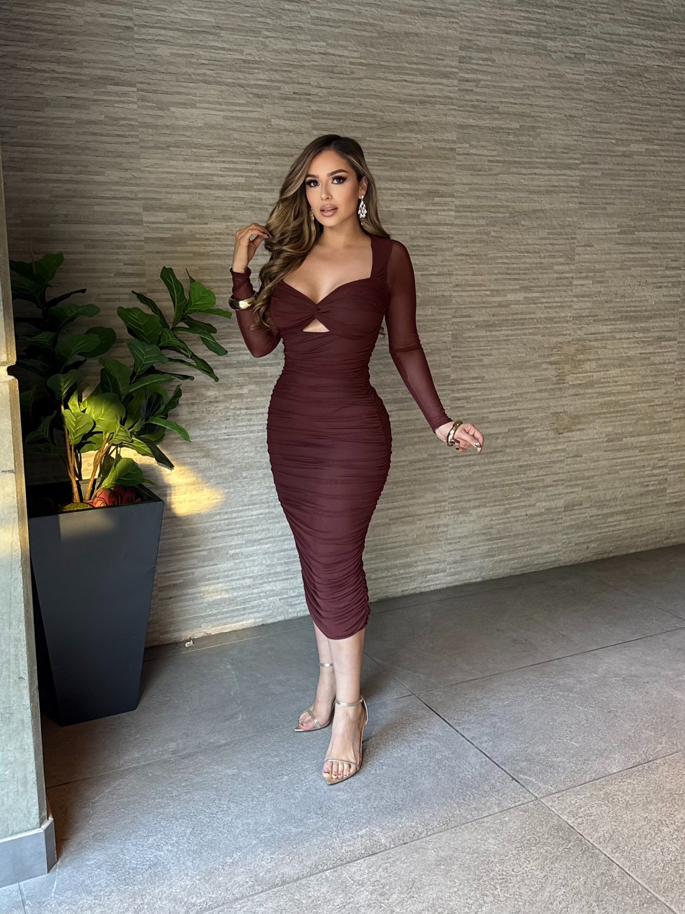 Our Ray Mesh Dress is a must have! A dress featuring a below the knee length,a slit, sheer long sleeves, ruched design,back zipper,body-con silhouette.